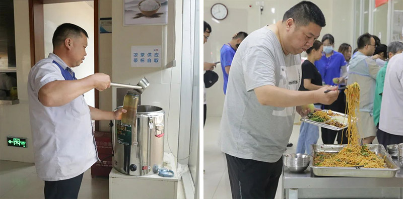 食堂還為所有職工貼心準(zhǔn)備了消暑解渴的免費(fèi)涼茶,配方有金銀花、菊花、蒲公英、甘草等,既能防暑,又有清熱化濕、提神醒腦等功效。清爽開胃的涼面,拌一拌,食欲滿滿。