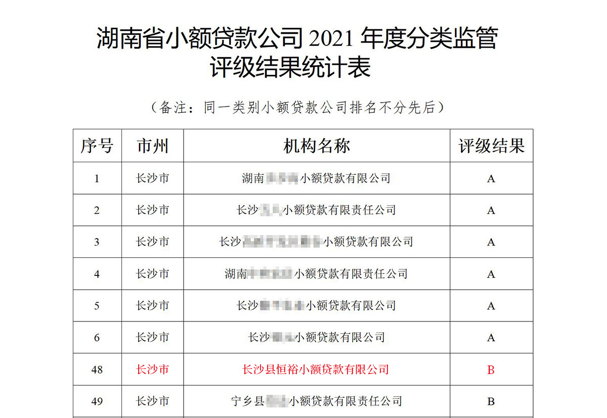 被湖南省金融辦監(jiān)管評(píng)級(jí)為B級(jí)資質(zhì)單位。